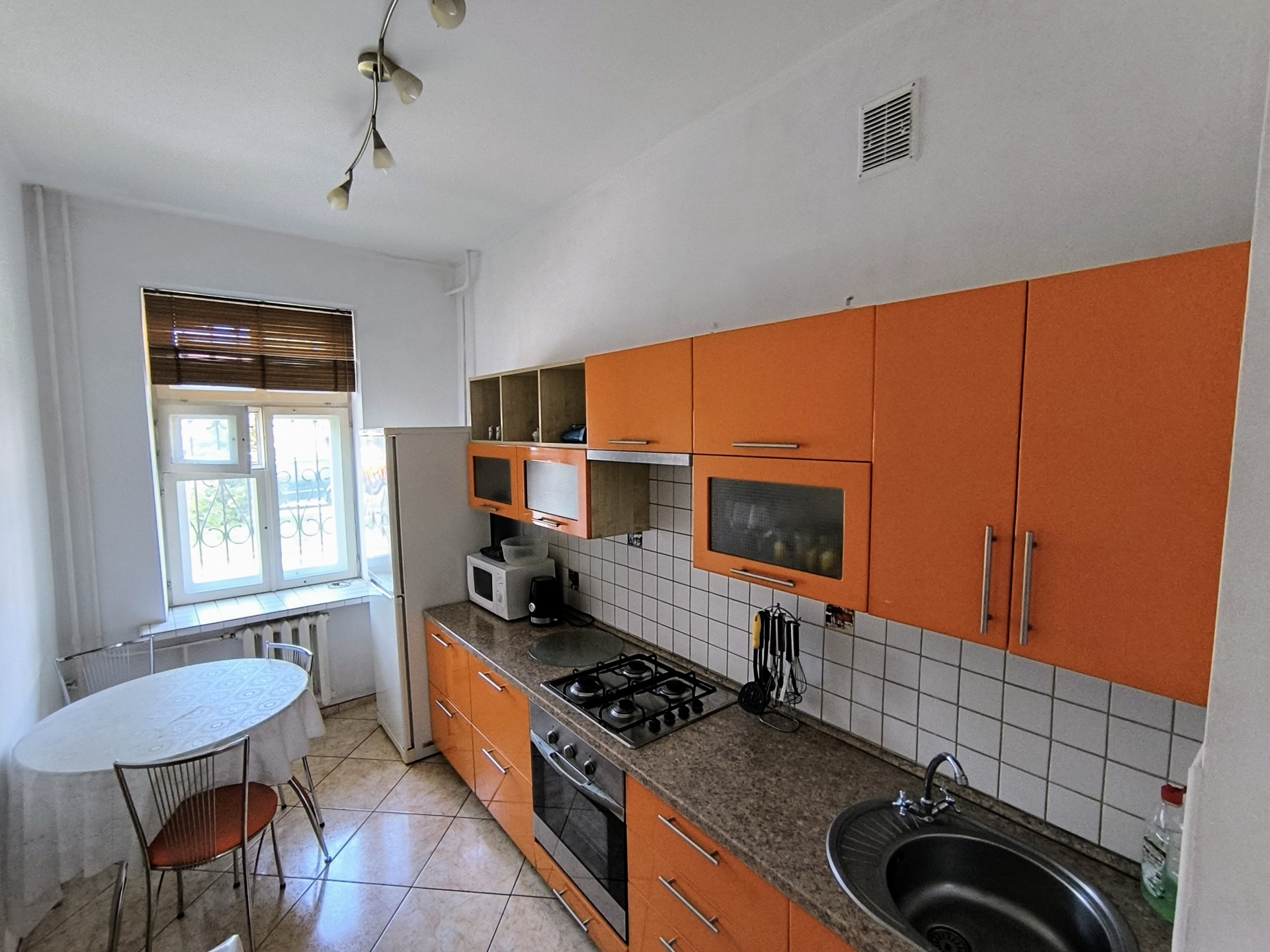 На кухне плита, микроволновая печь, эл. чайник, духовой шкаф, посуда для приготовления и сервировки, холодильник.