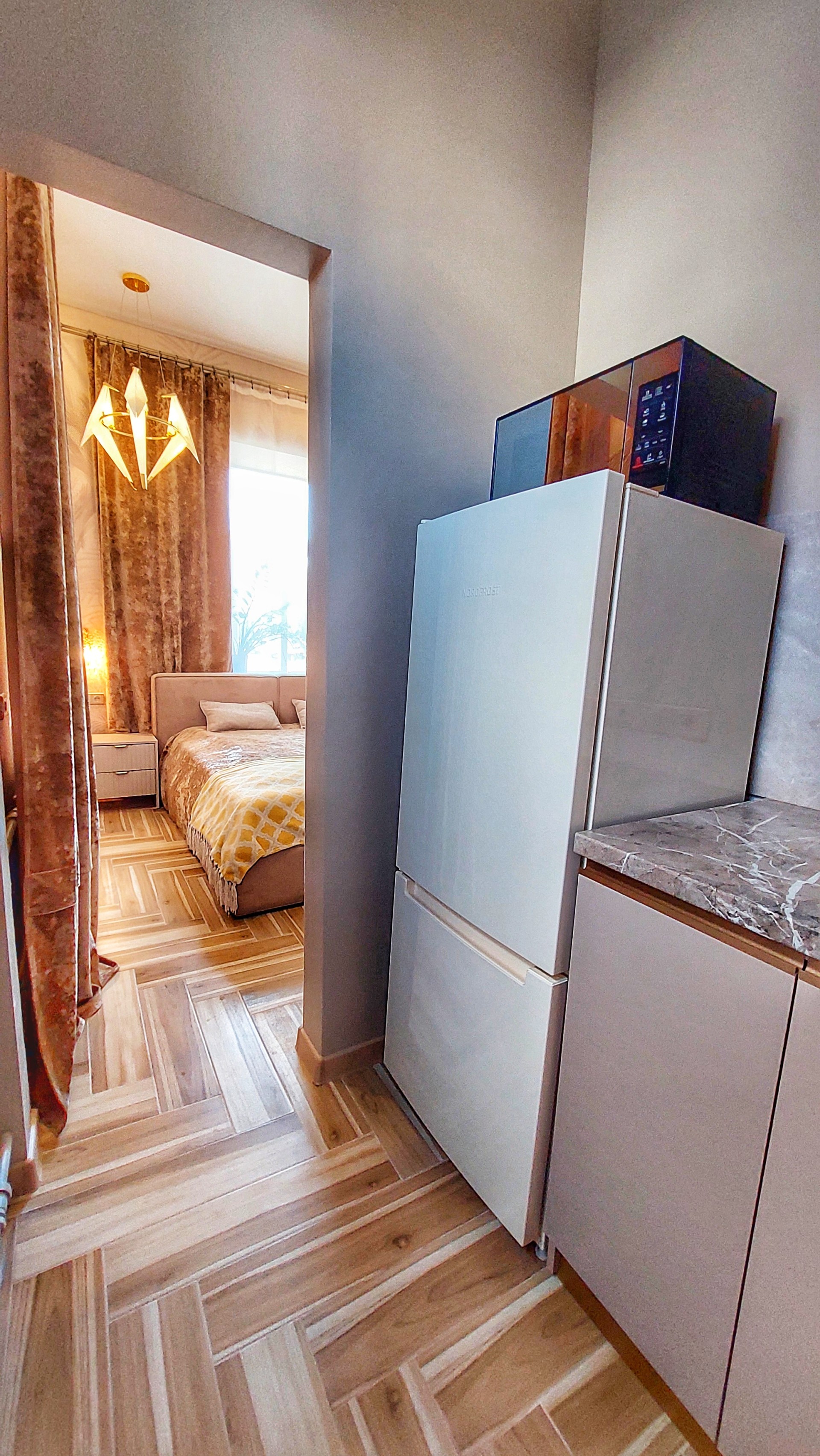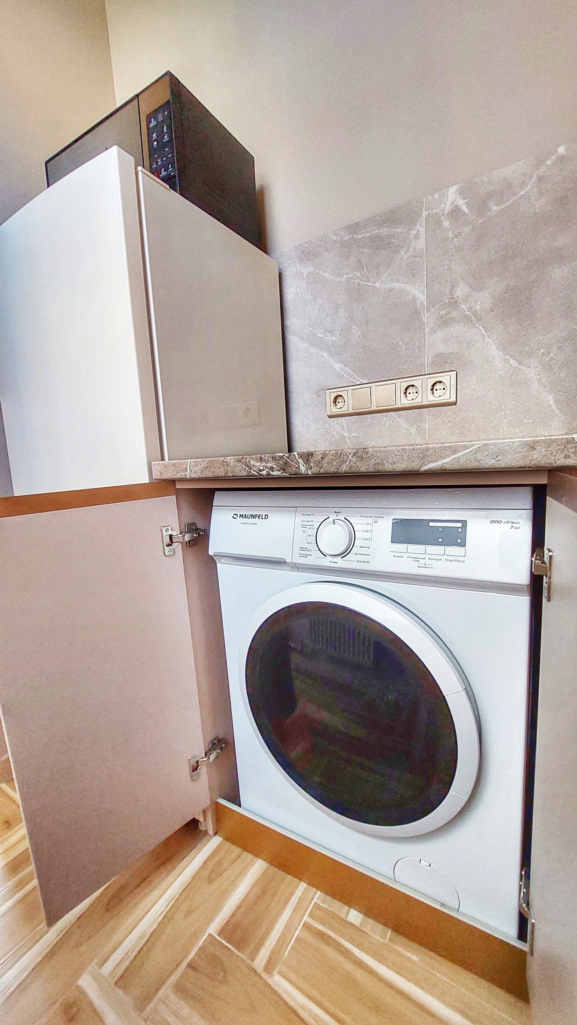Имеется вся необходимая бытовая техника стиральная машина, чайник, микроволновка, холодильник, варочная индукционная панель с необходимой посудой.