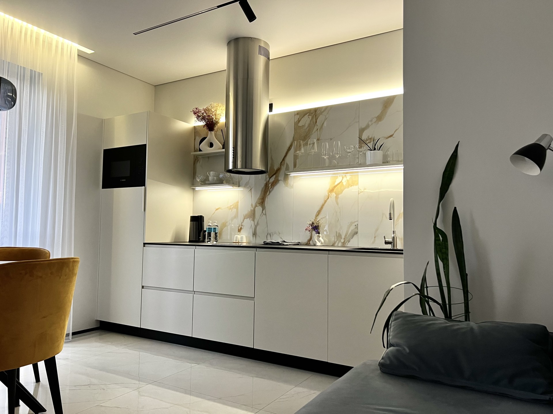 Апартаменты укомплектованы всей необходимой премиальной техникой (TV Samsung 55, встроенный холодильник, электрочайник, индукционная плита, встроенная микроволновка, посудомойка, мини-отпариватель, стиральная машина) постельными и бытовыми принадлежностями (чай, кофе,)