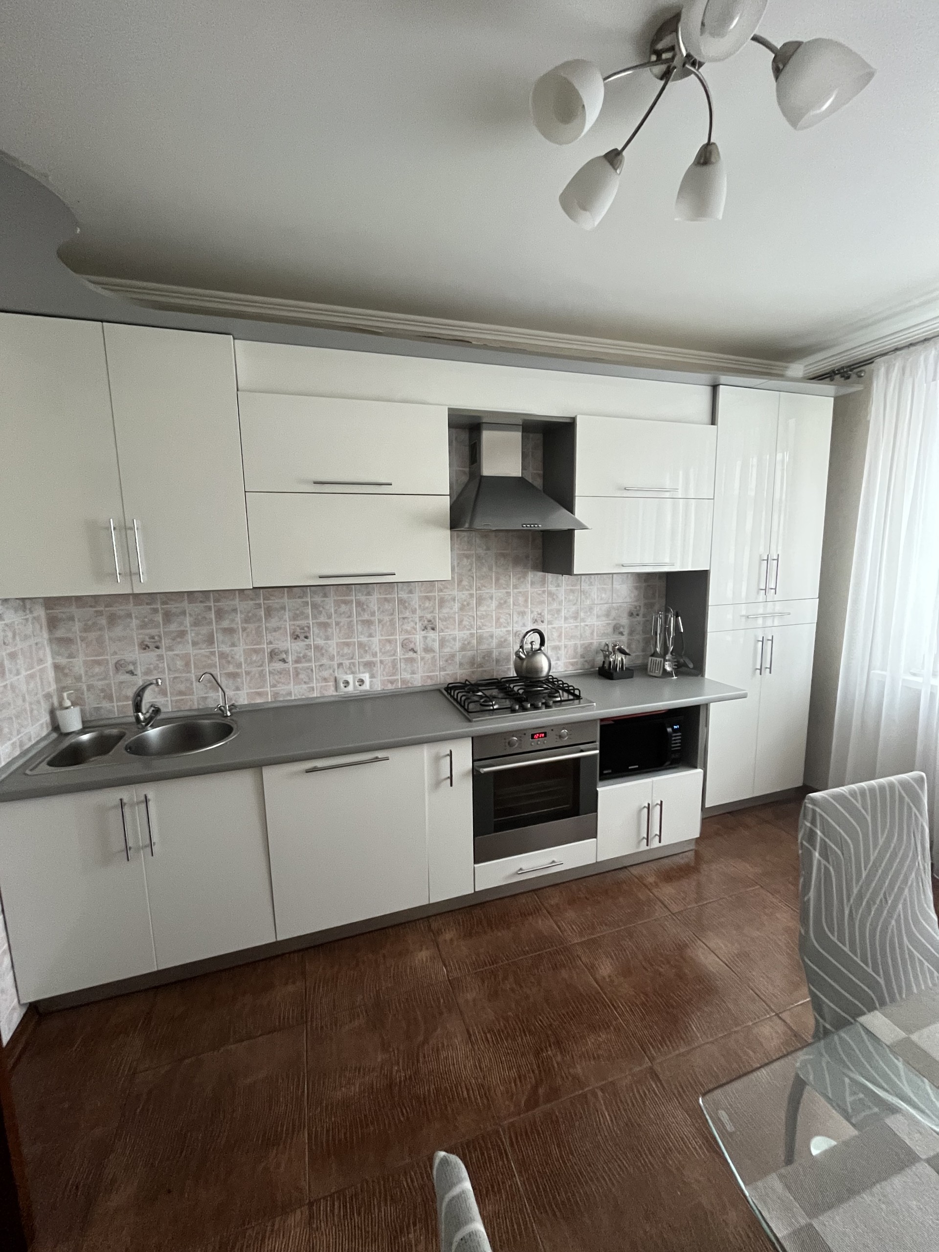 Кухня оборудована: газовая плита, духовка, посудомоечная машина, холодильник, микроволновка, посуда для приготовления и сервировки. Чай, кофе.